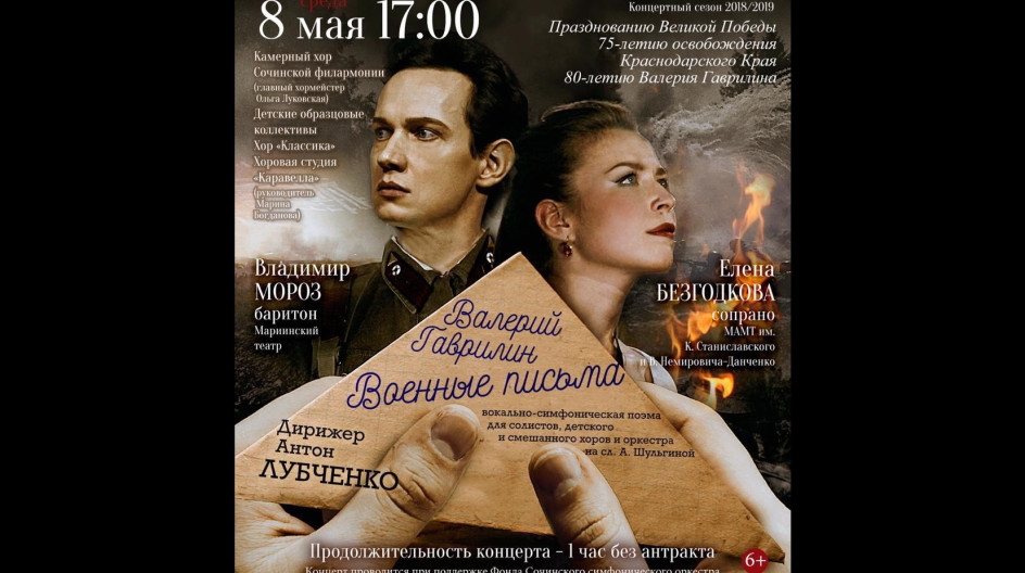 8 мая в Зимнем театре состоялся праздничный концерт «Военные письма». Программа включала в себя выступления Камерного хора Сочинской Филармонии, детских образцовых коллективов, хора «Классика», солистов Мариинского театра и многое другое.