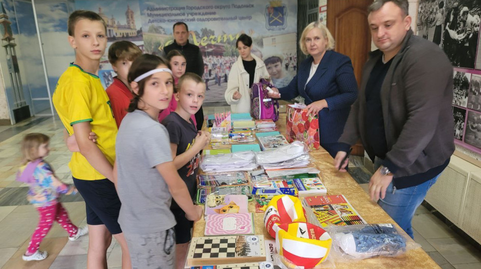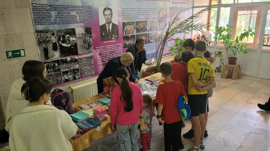 в пунк временного размещения "Мечта" детям из Курской области, ДНР и ЛНР привезли канцтовары к школе, одежду, рюкзаки.