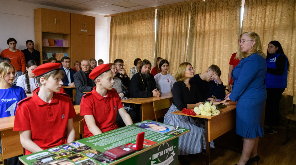 В открытии «Парты героя» приняли участие родные бойца, погибшего в зоне СВО, защищая интересы нашей Родины. Я рассказала присутствующим, что Сергей отправился на фронт в начале 2024 года, воевал с позывным «Пианист». Сергей стал санинструктором, пройдя профессиональную программу военно-медицинской подготовки - его родители отмечают, что его целью в жизни всегда была помощь людям. За мужество и героизм, проявленные в ходе выполнения боевых заданий, он был награжден медалью «За спасение погибавших». К сожалению, посмертно награжден медалью «За отвагу».