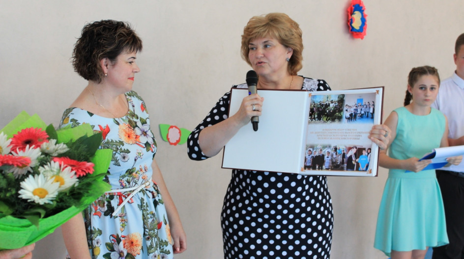Классным руководителям выпускников школ Белокрыльцевой Ольге Александровне и Сулохину Александру Дмитриевичу Жанна Беловол вручила фотоальбомы с дарственной надписью и цветы.