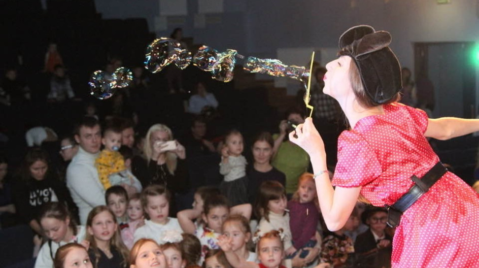 В фойе Дворца творчества маленьких гостей встречали герои мультфильма "Барбоскины" и символ 2020 года-мышка Минни - они играли, танцевали и водили хороводы у новогодней елки.