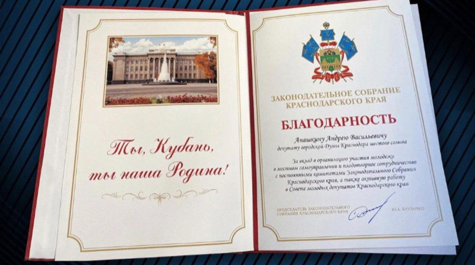 Отдельными наградами из числа членов Совета молодых при городской Думе Краснодара были награждены Андрей Анашкин и Мария Царевская, эффективная работа которых была высоко оценена губернатором Кубани Вениамином Кондратьевым и спикером ЗСК Юрием Бурлачко.