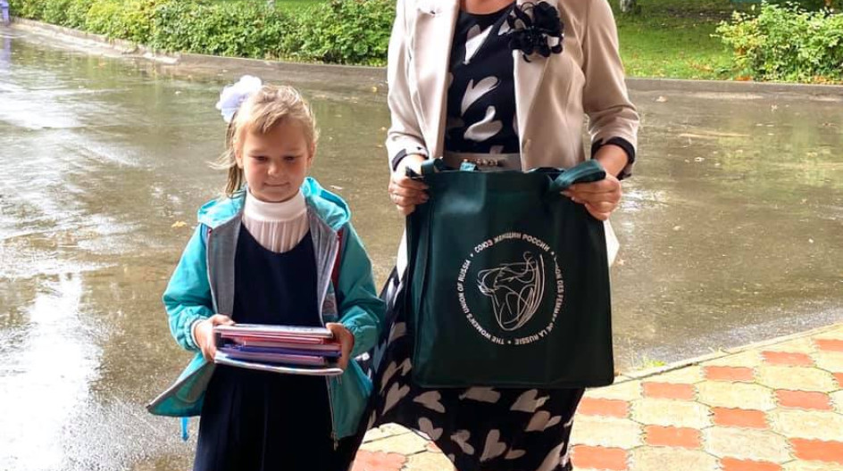 После торжественной линейки передала первокласснице Олесе Рубчиковой из многодетной семьи школьные принадлежности и книги для внешкольного чтения.