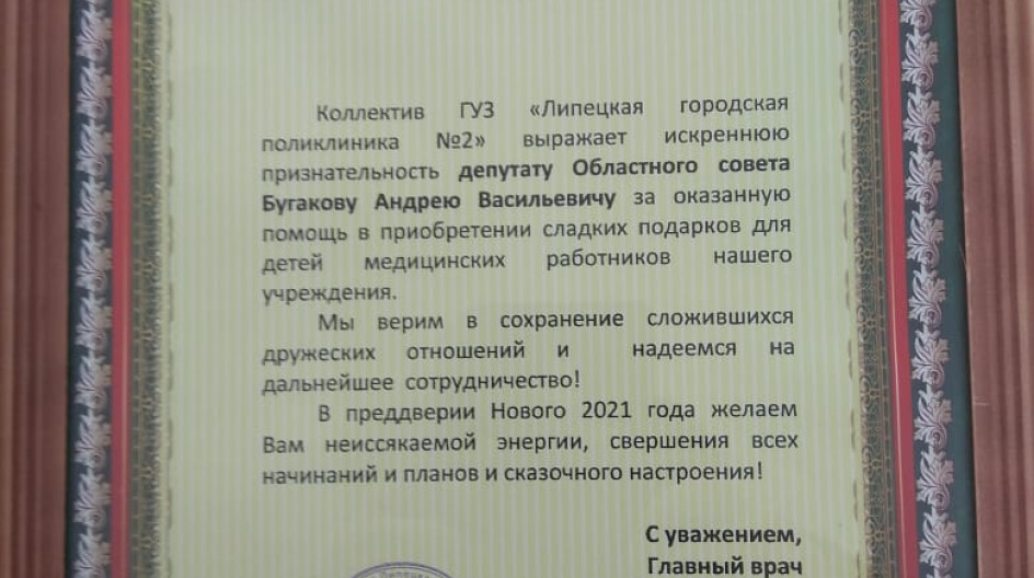 Бладарственное письмо от главного врача ГУЗ "Липецкая городская поликлиника №2"