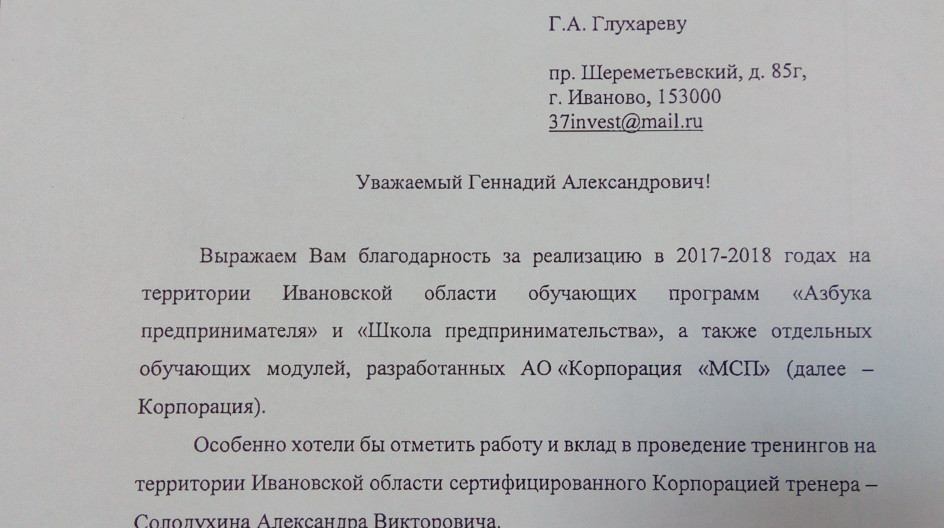 Благодарность Федеральной корпорации по развитию малого и среднего предпринимательства