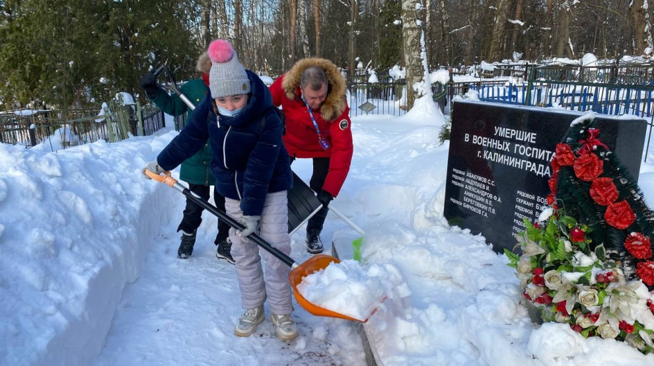 Несмотря на мороз, школьники и члены местного политсовета упорно сражались с белоснежными сугробами. Через несколько минут территория около памятника была расчищена.