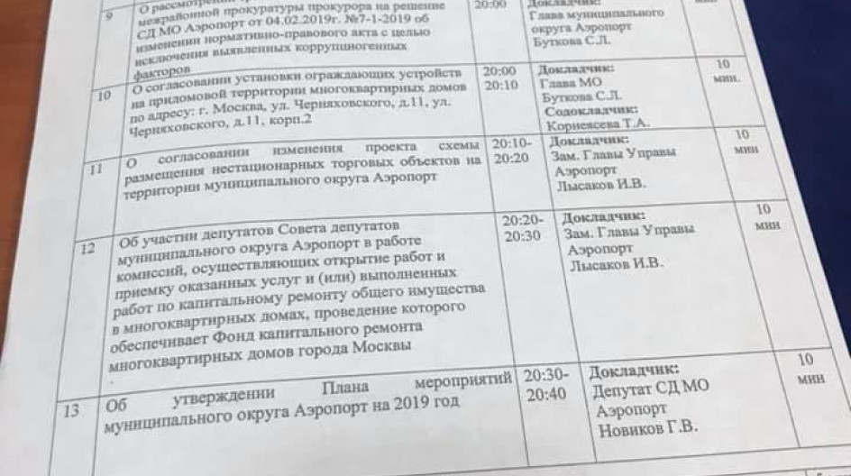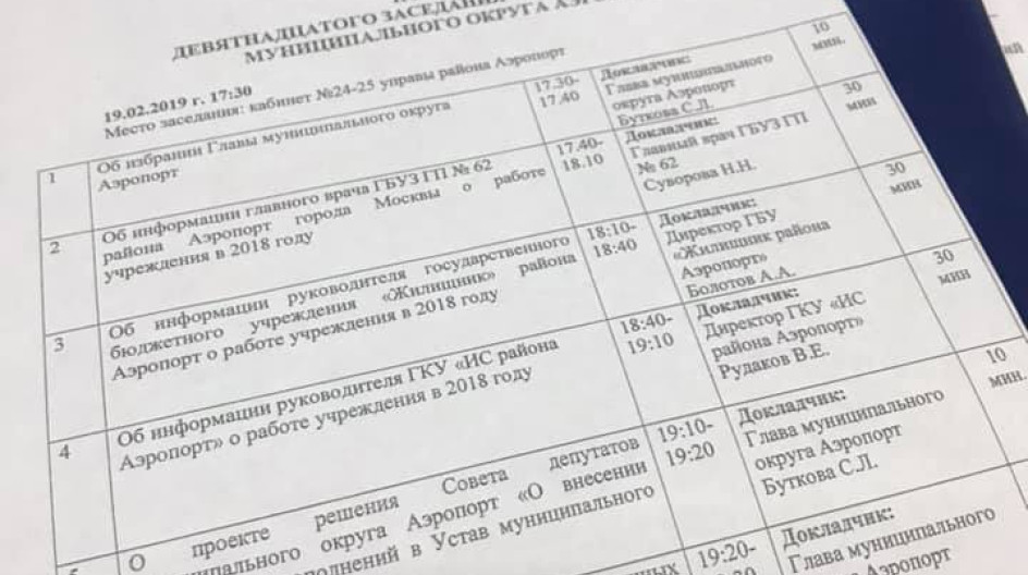 Состоялось очередное 19 заседание Совета депутатов муниципального округа Аэропорт. На повестке дня было 14 вопросов, три из них - отчеты.