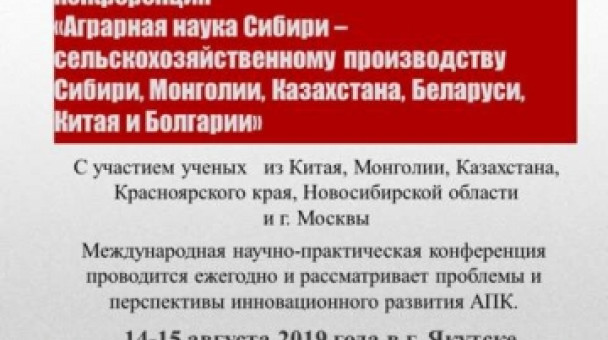 XXII международная научно-практическая конференция «Аграрная наука - сельскохозяйственному производству Сибири, Монголии, Казахстана, Беларуси, Китая и Болгарии», посвященная 50-летию СО РАСХН и 70-летию Якутского научного центра Сибирского отделения Российской академии наук, состоится в столице Якутии 14-15 августа 2019 года.