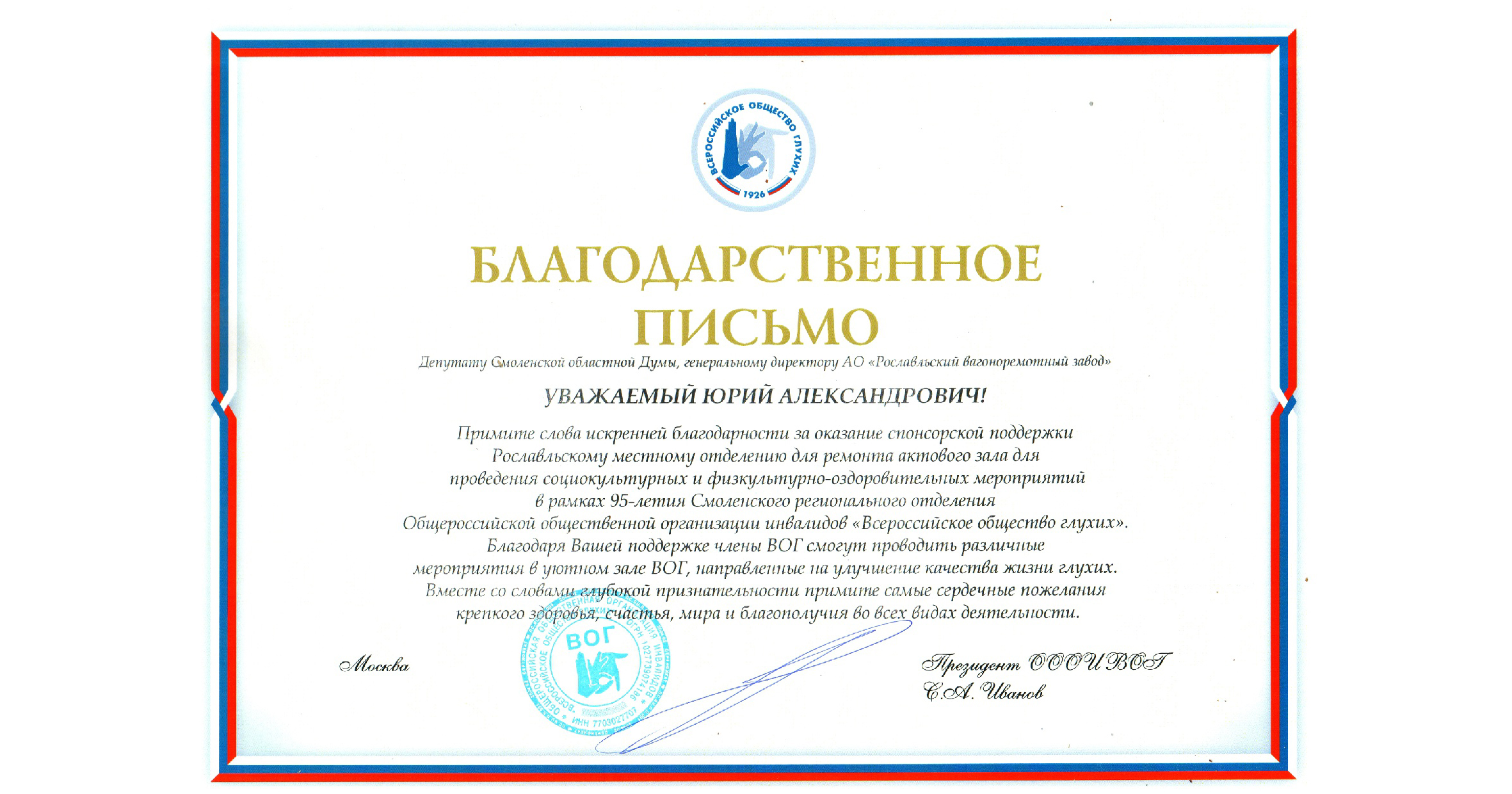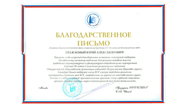 Благодарственное письмо президента Общероссийской общественной организации инвалидов «Всероссийское общество глухих» за оказание спонсорской поддержки Рославльскому местному отделению для ремонта актового зала.