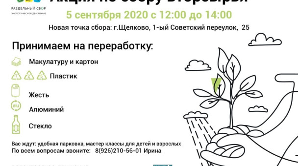 В Щёлково пройдёт очередная акция по сбору вторичного сырья 5 сентября с 12:00 до 14:00. Адрес: 1-й Советский переулок, д. 25, Тринити парк. Можно принести: 1. Макулатуру. Помимо книг, газет и журналов, туда входят упаковки от пищевых продуктов, коробочки от лекарств с маркировкой 21 и 22, рекламные листовки. Не принимаются: упаковки от яиц, чеки, втулки. 2. Гофрокартон. Это который с прожилками на поперечном срезе. 3. Пластиковые бутылки. Обязательно ополосните и сомните бутылку. Белые бутылки от молочных продуктов отделяем от прозрачных. Они не друзья. 4. Крышечки. Пластиковые. Любых цветов и размеров. 5. Стаканы от молочных продуктов, контейнеры из-под мяса и прочие пищевые ёмкости с маркировкой 5 или буквами РР. 6. Пластиковые ёмкости от бытовой химии, стаканчики от маленьких йогуртов и другие контейнеры с маркировкой 2 или буквами HDPE(PE-HD). 7. Стекло. Стеклянные прозрачные не битые бутылки, флаконы от духов. 8. Алюминий. Только хорошо сомните. Алюминиевую фольгу тоже можно. 9. Жесть. С консервными банками, по возможности, проделайте следующее - вырезать дно, наступить на банку и вставить вырезанное дно обратно. 10. Зубные щётки. Если остались вопросы, звоните Ирине - 8-926-210-56-01.