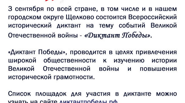«Диктант Победы» будет проводиться уже второй год. В этом году акция пройдет 3 сентября. Привлечь внимание людей к истории Великой Отечественной войны, к тем фактам и событиям, которые происходили тогда – вот цель «Диктанта Победы». Сами вопросы, которые были и будут сформулированы в диктанте, позволяют ещё раз вернуться к событиям тех лет, осмыслить и задуматься над их значением для поколений, живущих сегодня На площадках «Диктанта Победы» на территории городского округа соберутся люди разных поколений, которых объединяет любовь к своей Отчизне, благодарность и преклонение перед теми, кто сражался и победил! Всю информацию смотрите на сайте проекта - диктантпобеды.рф #ДиктантПобедыМО #ДиктантПобеды #ЕдинаяРоссия #Подмосковье