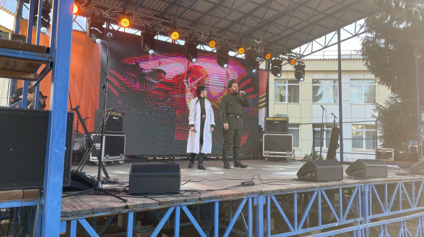 Поздравил со сцены жителей города с Днем Великой Победы и пожелал гордо нести звание наследников победы.