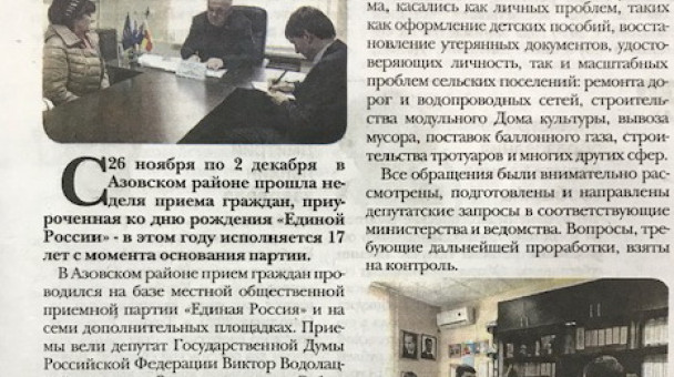 С 26 ноября по 2 декабря в Азовском районе прошла неделя приема граждан, приуроченная ко дню рождения «Единой России» - в этом году исполняется 17 лет с момента основания партии. В Азовском районе прием граждан проводился на базе Местной общественной приемной партии «Единая Россия» и на семи дополнительных площадках.